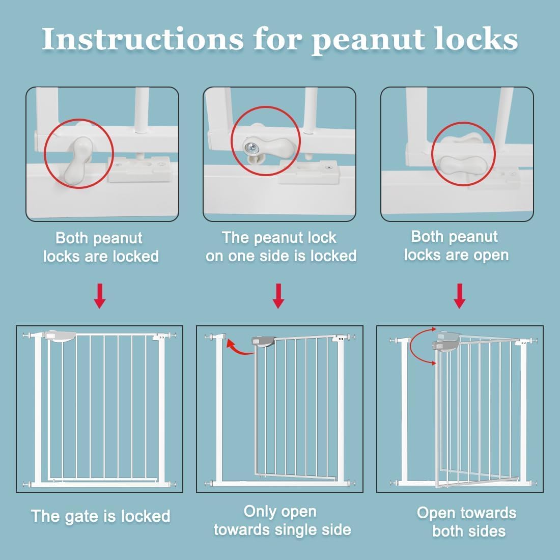 - 【Triple Lock System】Babies will be blocked by the safety baby gate since we designed a triple locking system that is easy for adults to open while tough for babies. At the top of the gate, there are two buttons and each of them controls one lock. To open the gate, you should press both buttons simultaneously. And at the bottom of the gate, there are two peanut locks to control the opening direction and locking. With these triple locks, curious babies will be well protected by our metal gate